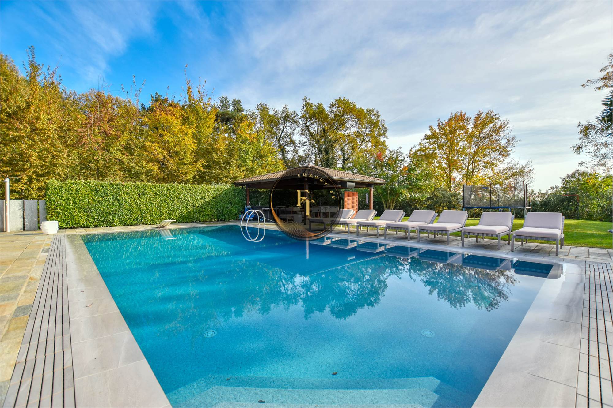 All’esterno, la piscina a sfioro di 14x7 metri con impianto a sale, riscaldata e automatizzata, rappresenta il fulcro del giardino. È dotata di sensori per il controllo del pH, pompa di calore da 12 kW e profondità variabile da 130 a 270 cm. L’area è completata da cucina esterna, impianto audio integrato Garvan, rete per cinema all’aperto e sistema di irrigazione con vasche di raccolta acqua.