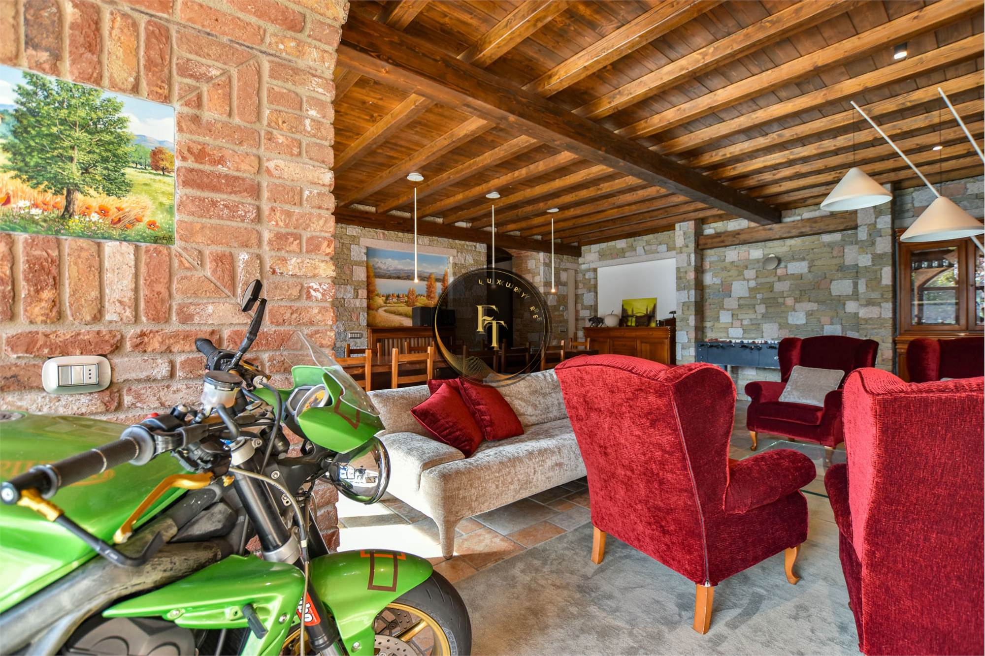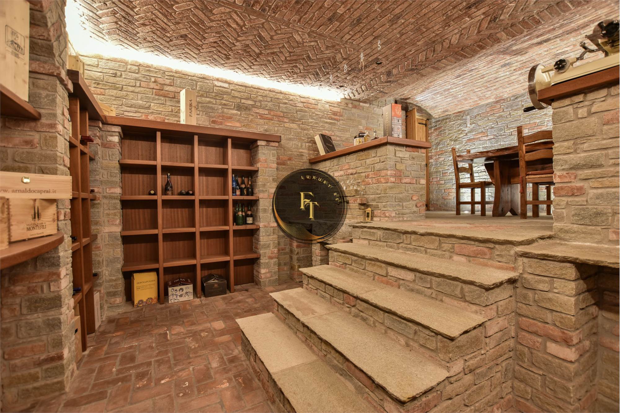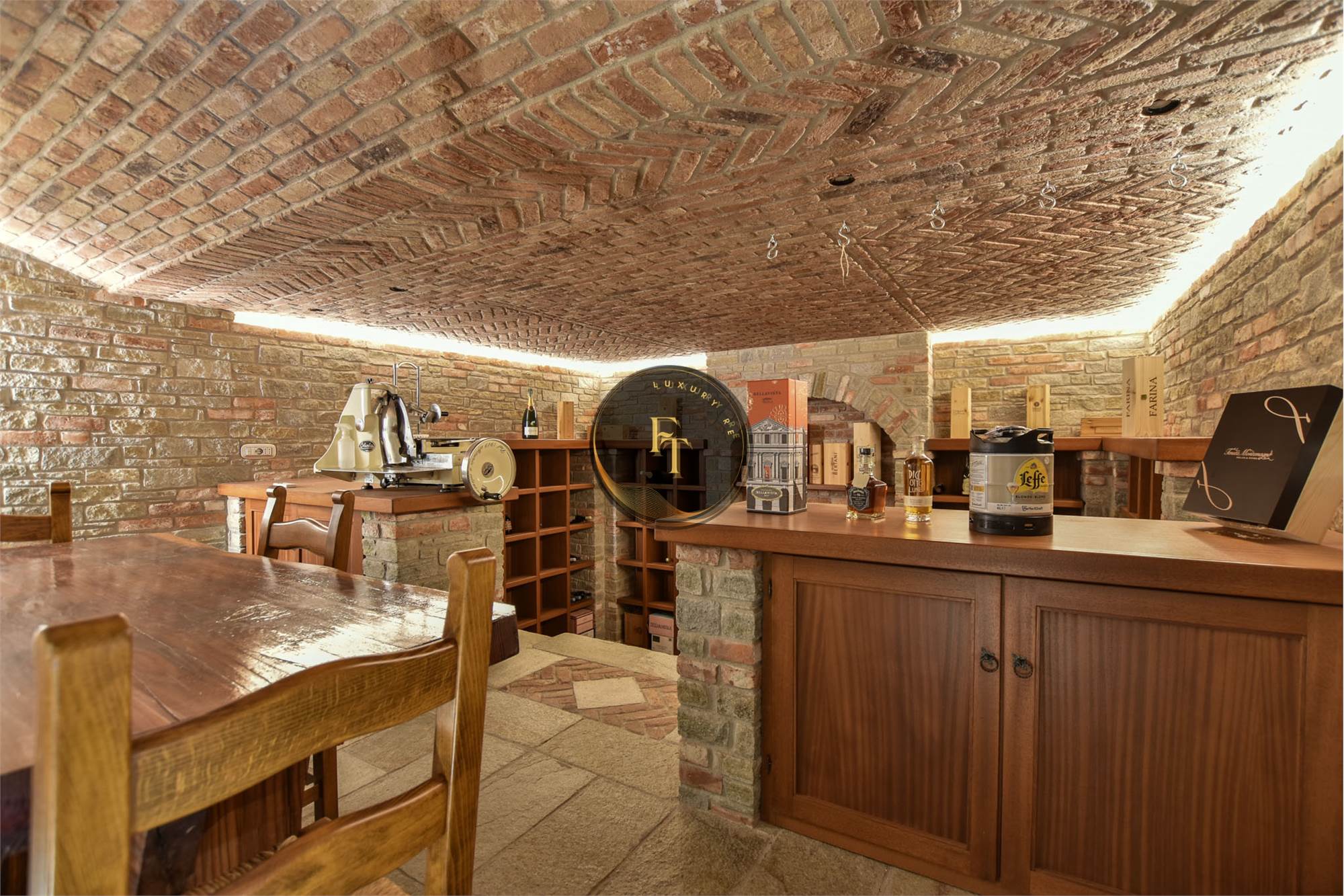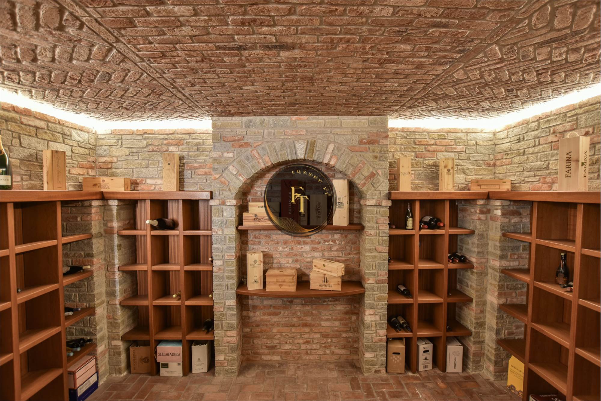 Il piano seminterrato, con accesso diretto al cortile, comprende una grande taverna dal sapore classico, con pareti in pietra e mattoni, camino, cucina industriale attrezzata e zona relax; seguono sul piano un bagno, un’affascinante cantina vini climatizzata, la zona spa con sauna e bagno turco, un ripostiglio, lavanderia e locali tecnici. Da qui si accede anche al garage, in grado di ospitare fino a sette auto, oltre al grande cortile che permette di parcheggiare ulteriori vetture.