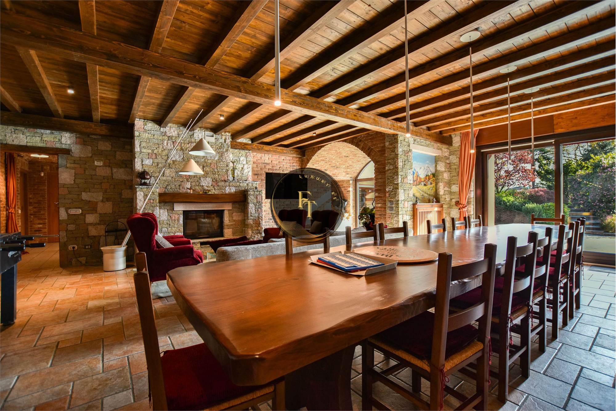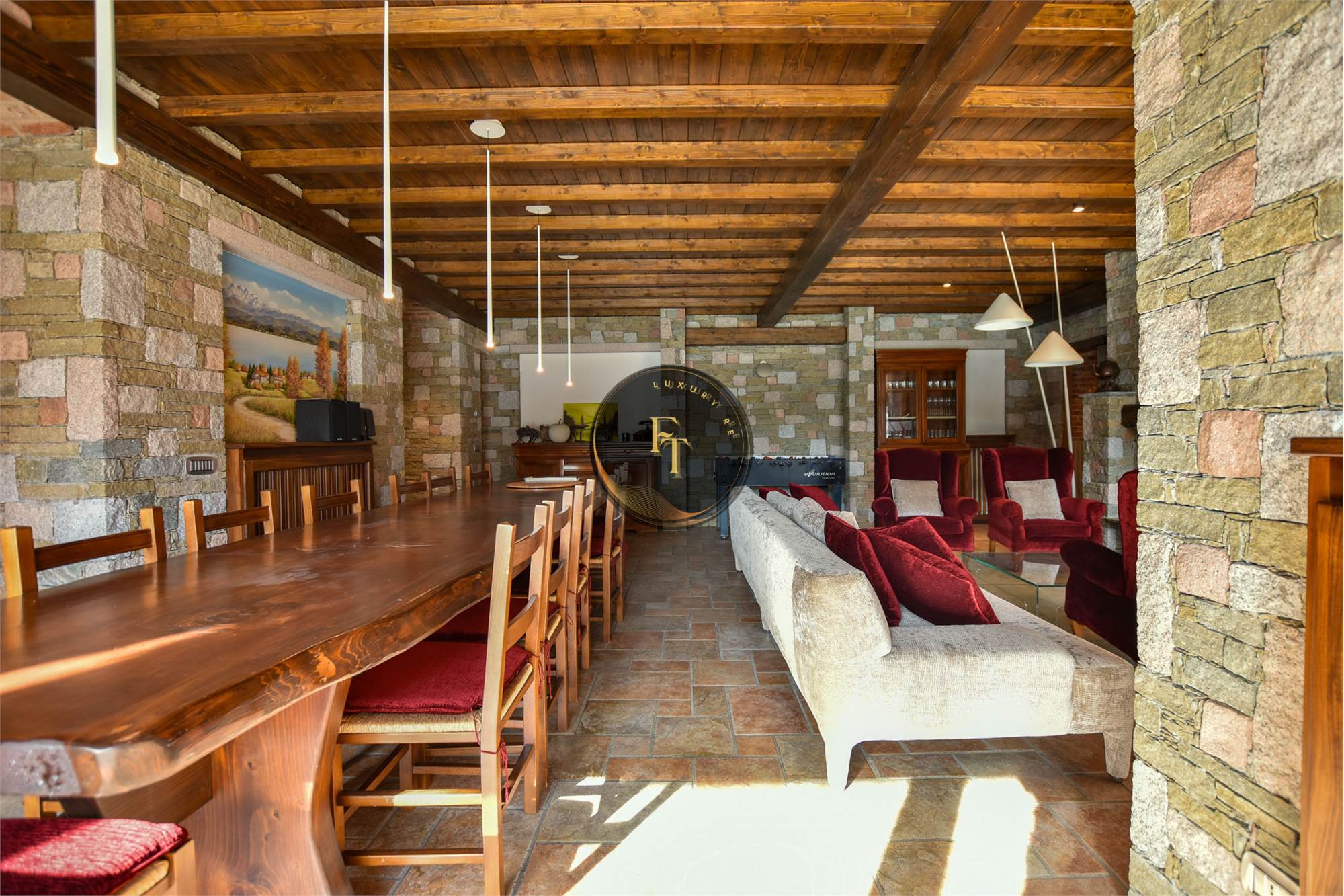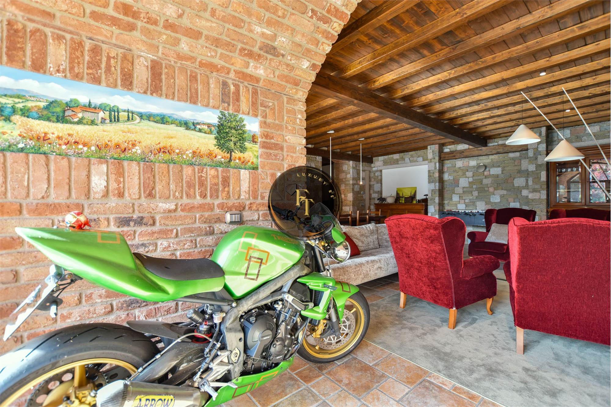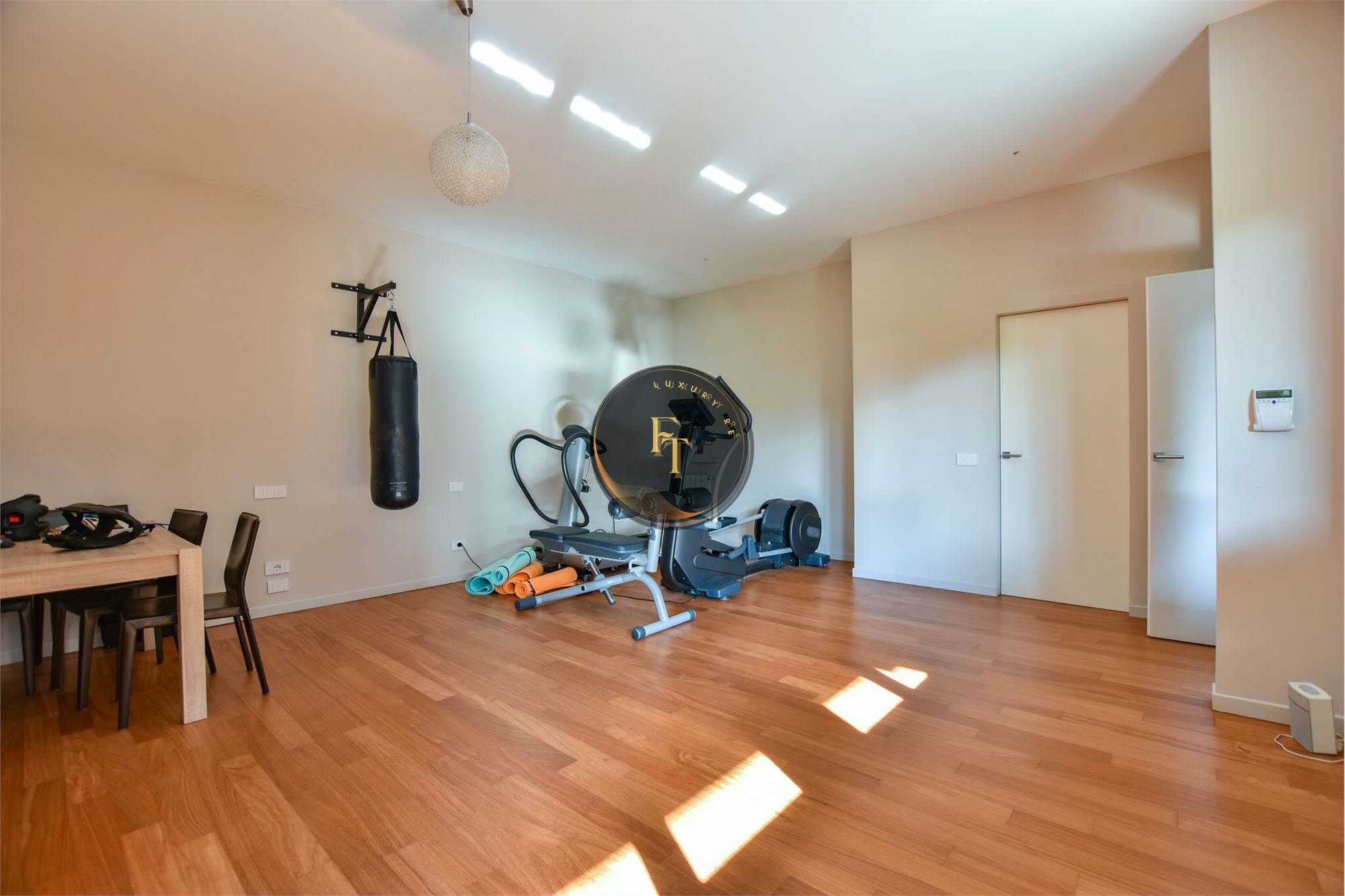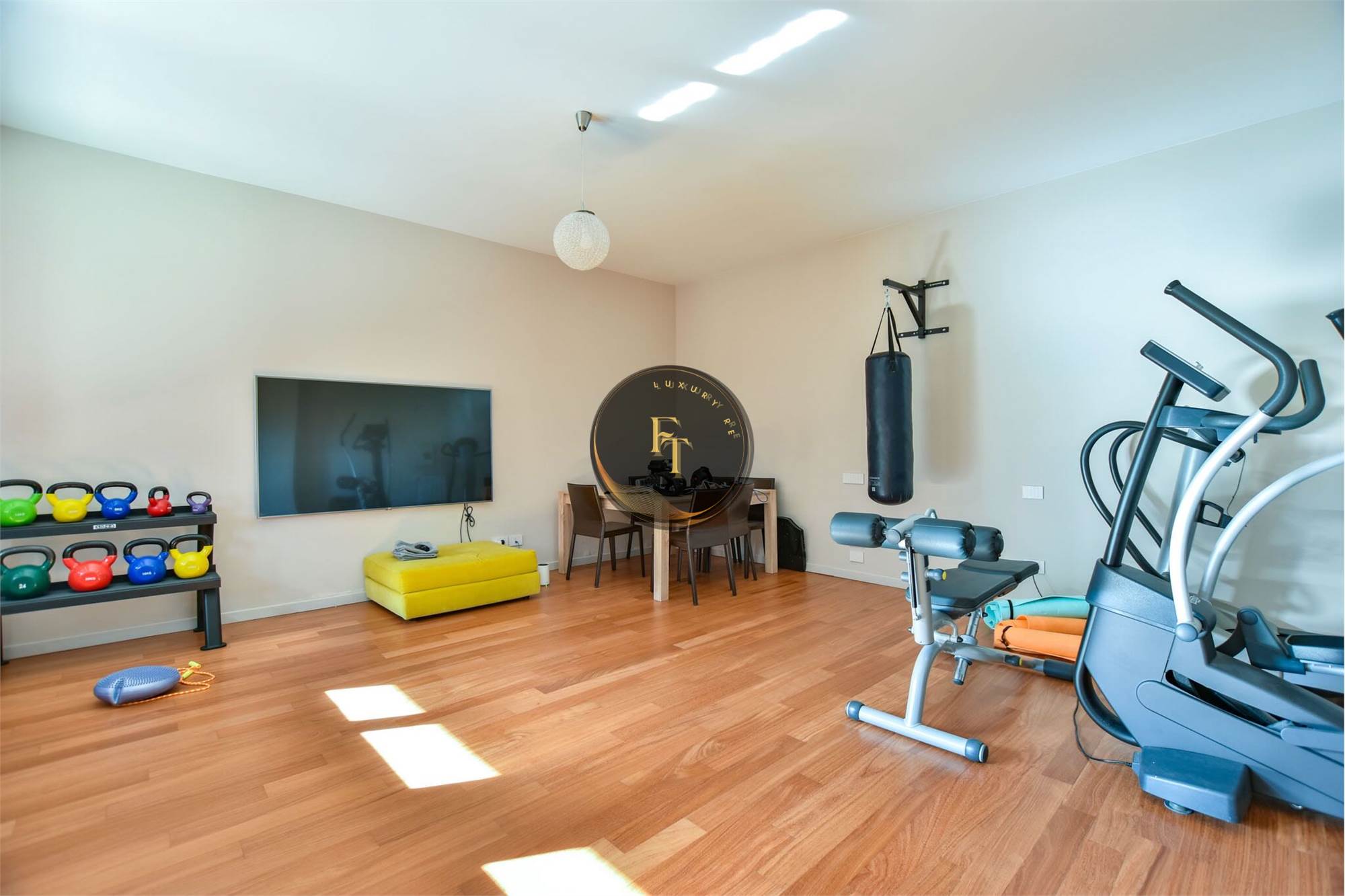 Il piano seminterrato, con accesso diretto al cortile, comprende una grande taverna dal sapore classico, con pareti in pietra e mattoni, camino, cucina industriale attrezzata e zona relax; seguono sul piano un bagno, un’affascinante cantina vini climatizzata, la zona spa con sauna e bagno turco, un ripostiglio, lavanderia e locali tecnici. Da qui si accede anche al garage, in grado di ospitare fino a sette auto, oltre al grande cortile che permette di parcheggiare ulteriori vetture.