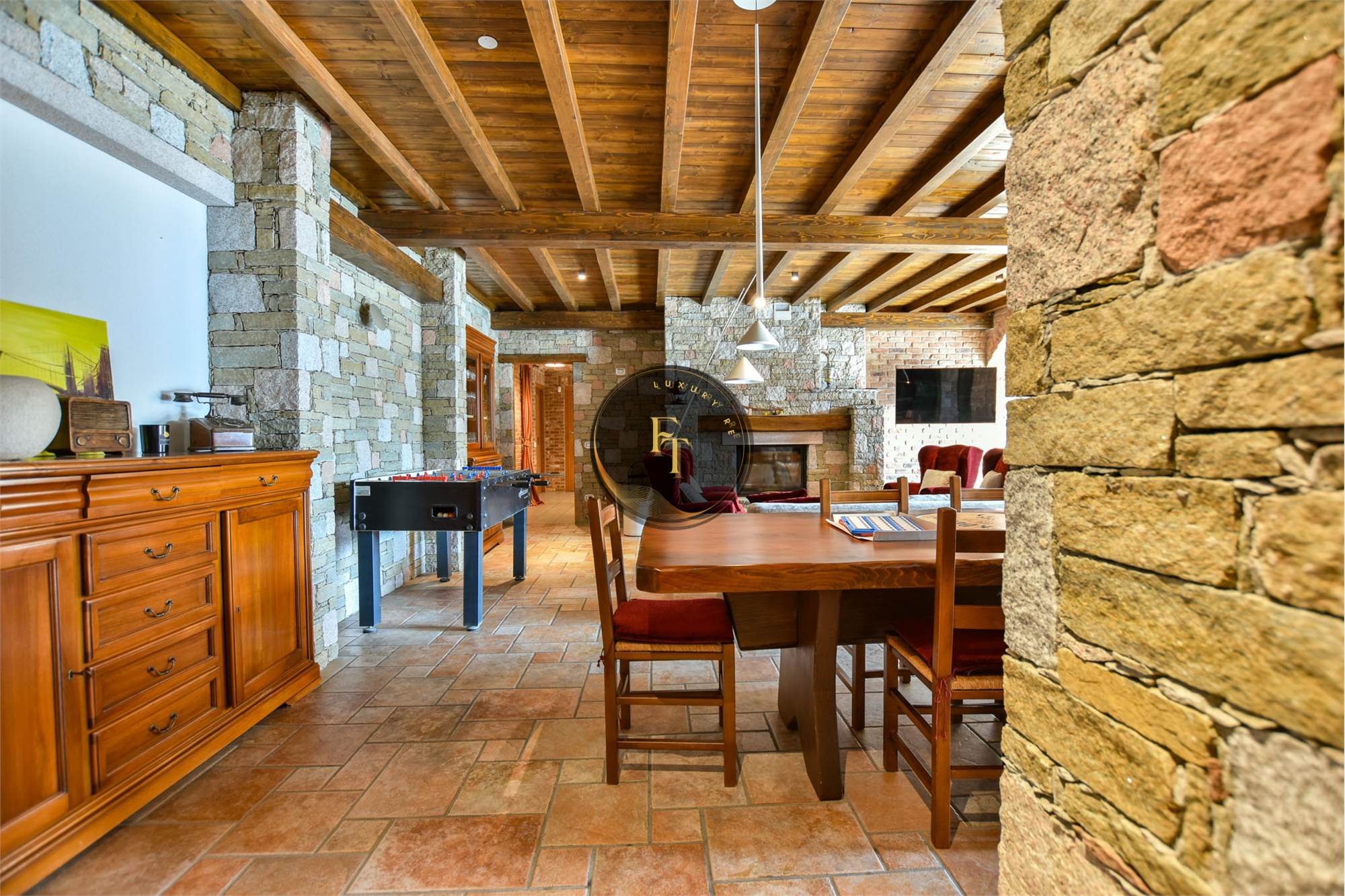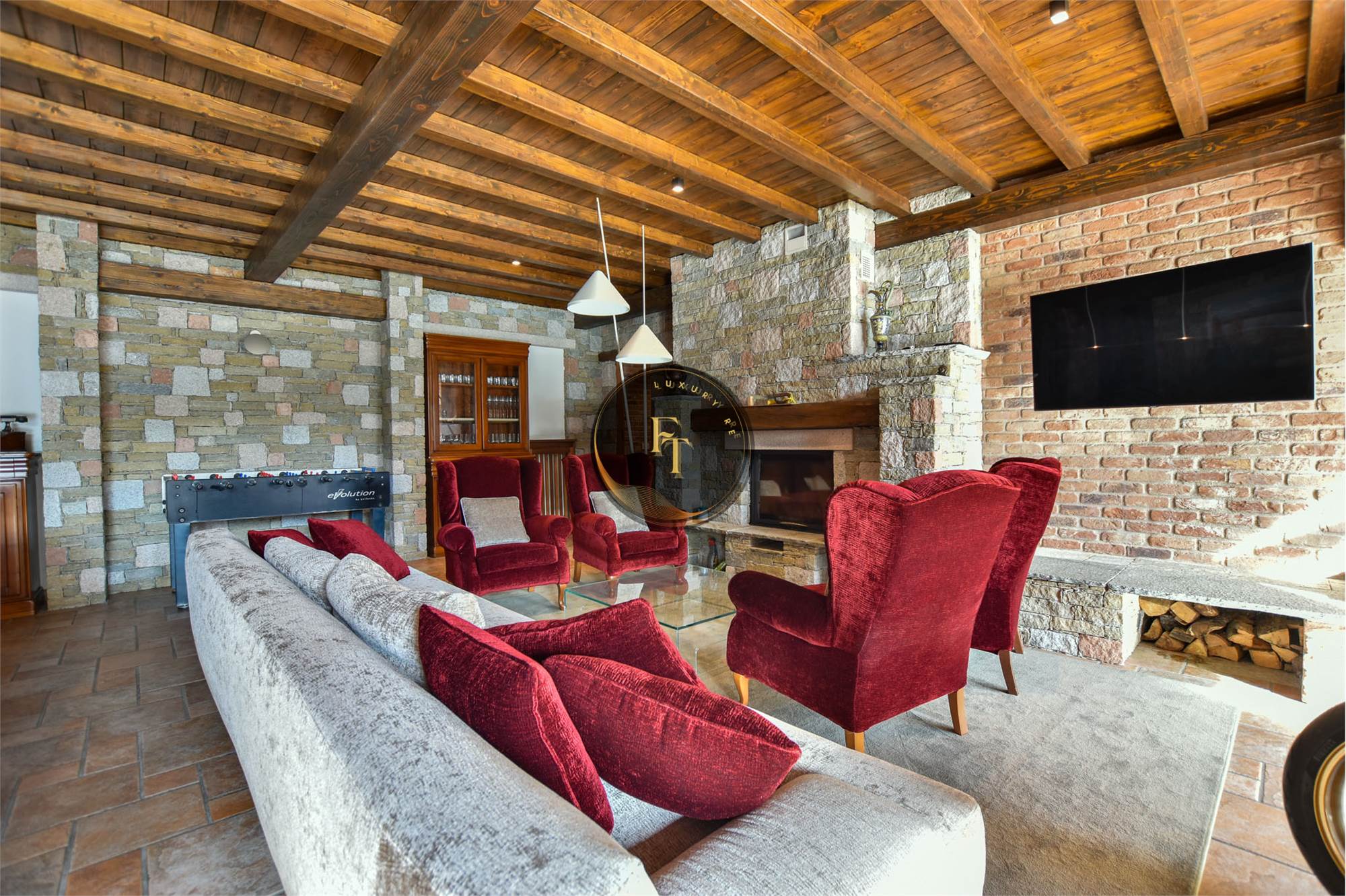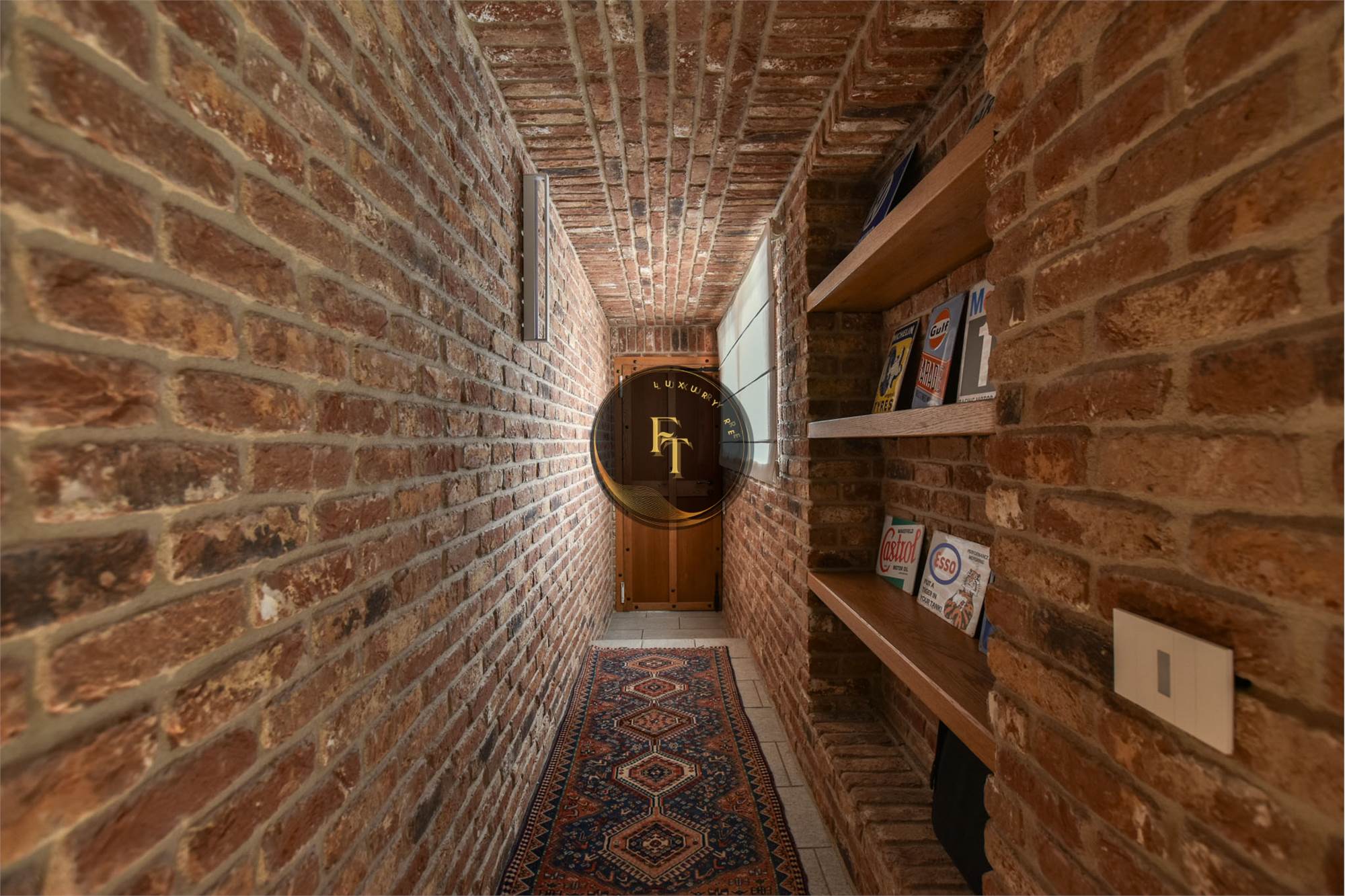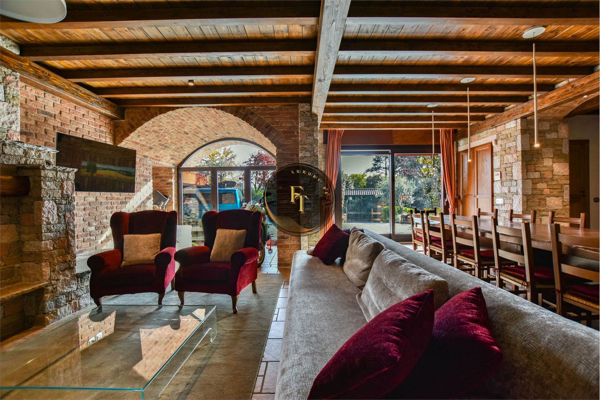 Il piano seminterrato, con accesso diretto al cortile, comprende una grande taverna dal sapore classico, con pareti in pietra e mattoni, camino, cucina industriale attrezzata e zona relax; seguono sul piano un bagno, un’affascinante cantina vini climatizzata, la zona spa con sauna e bagno turco, un ripostiglio, lavanderia e locali tecnici. Da qui si accede anche al garage, in grado di ospitare fino a sette auto, oltre al grande cortile che permette di parcheggiare ulteriori vetture.