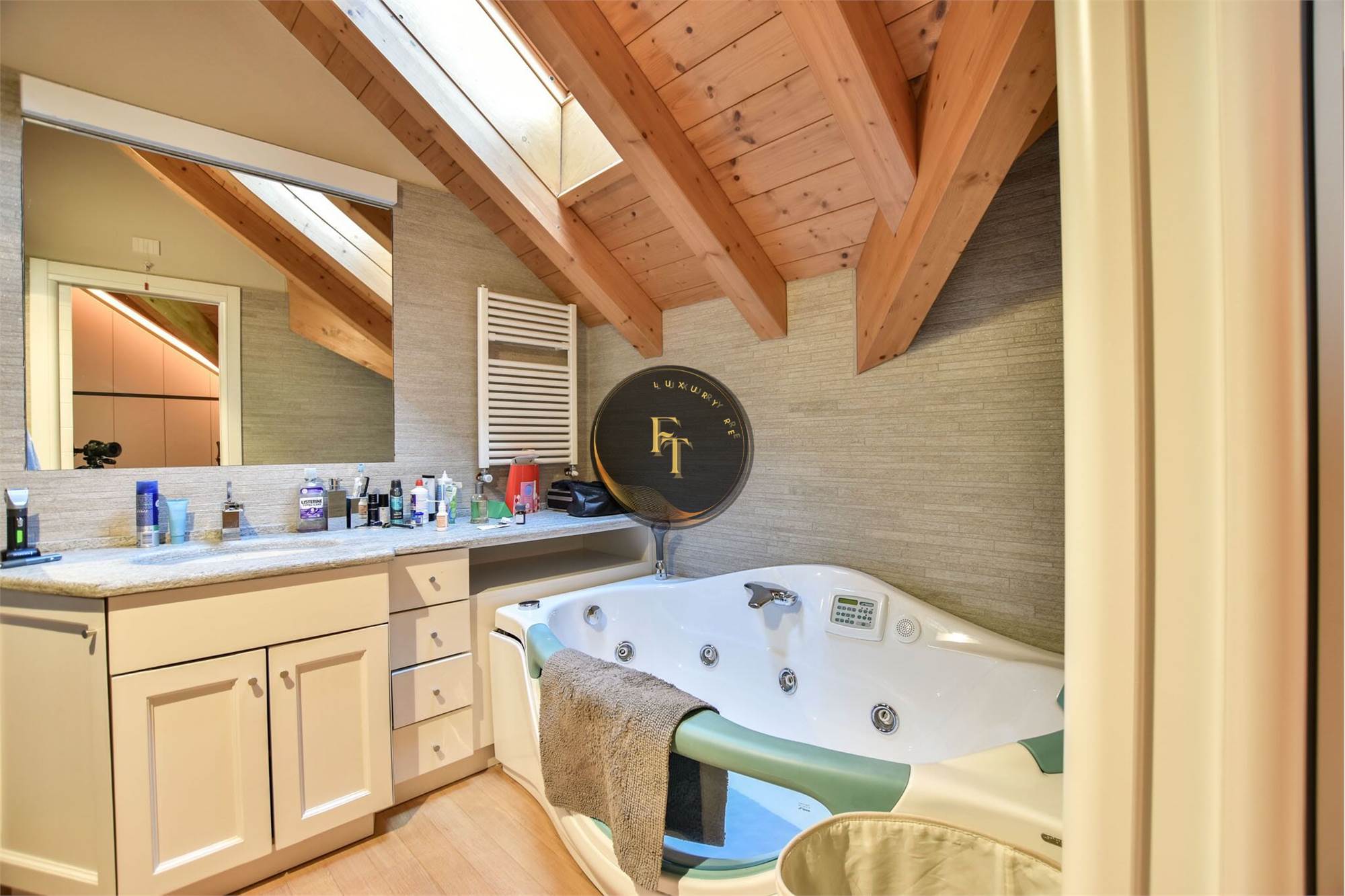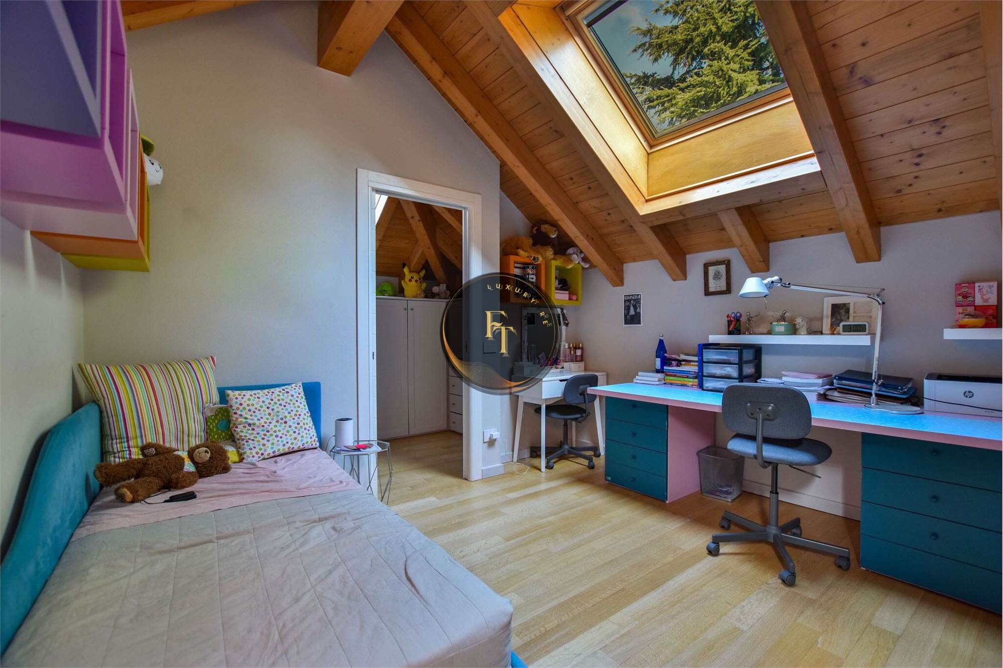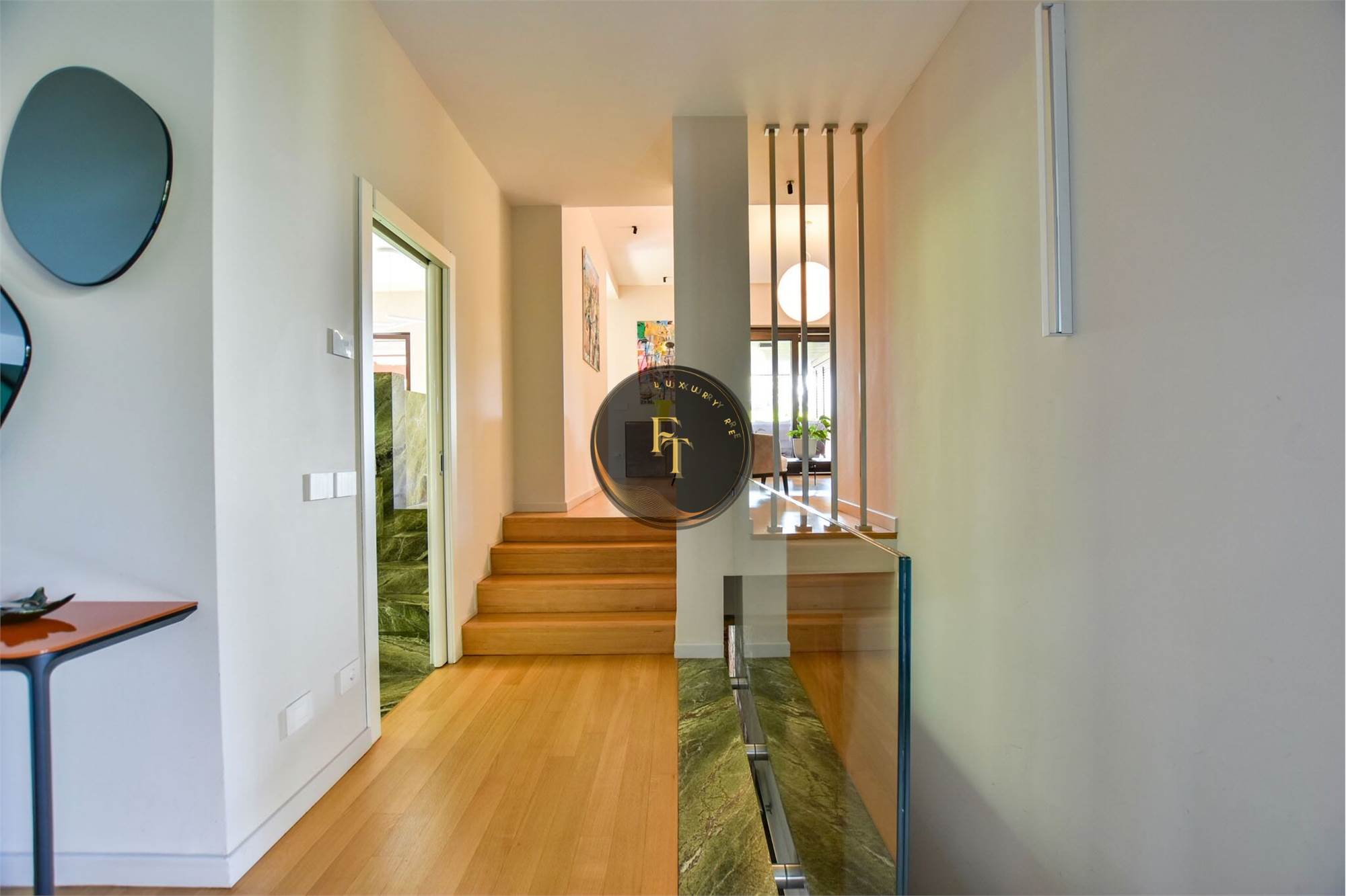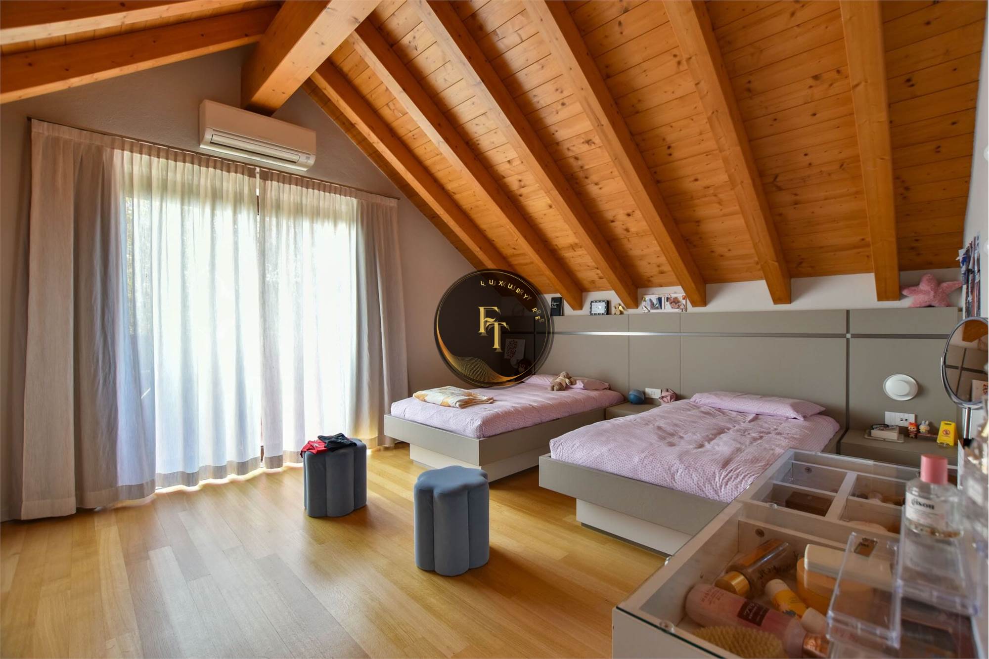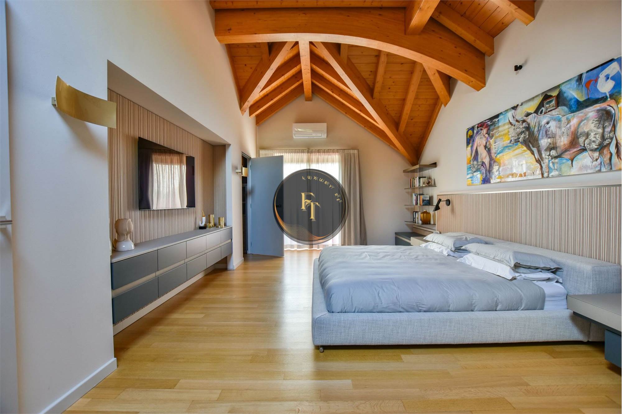 Il primo piano, caratterizzato dal soffitto con travi a vista, ospita uno studio con cabina armadio, una camera matrimoniale con bagno privato con vasca idromassaggio e doccia e balcone, un’ulteriore camera con bagno, anch’esso con doccia e vasca idromassaggio, e la suite padronale: un ampio disimpegno con arredi su misura conduce alla camera principale con doppia cabina armadio Molteni e un bagno interamente in marmo, dotato di vasca idromassaggio centrale, doppia doccia, doppi lavabi e sanitari.