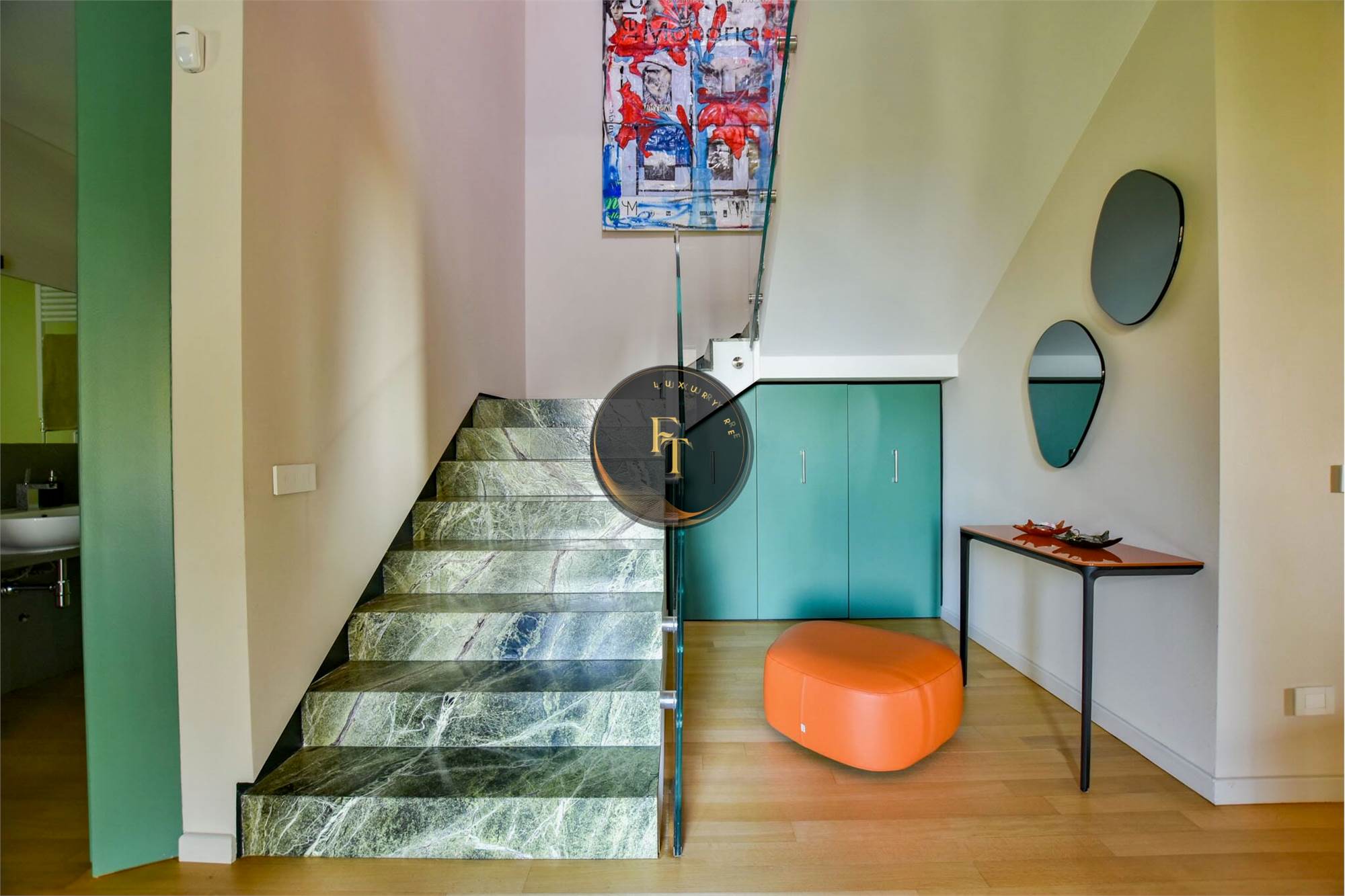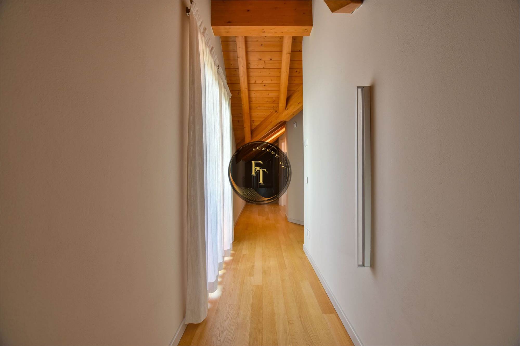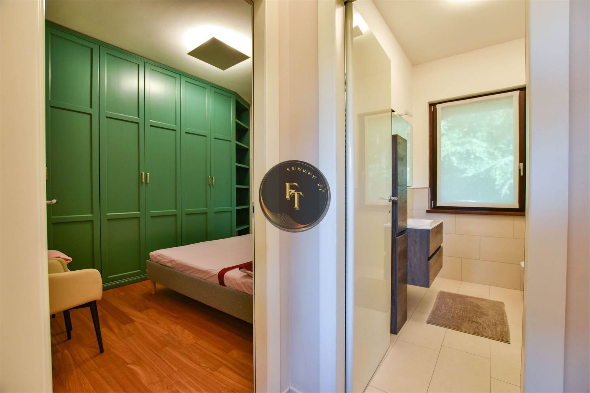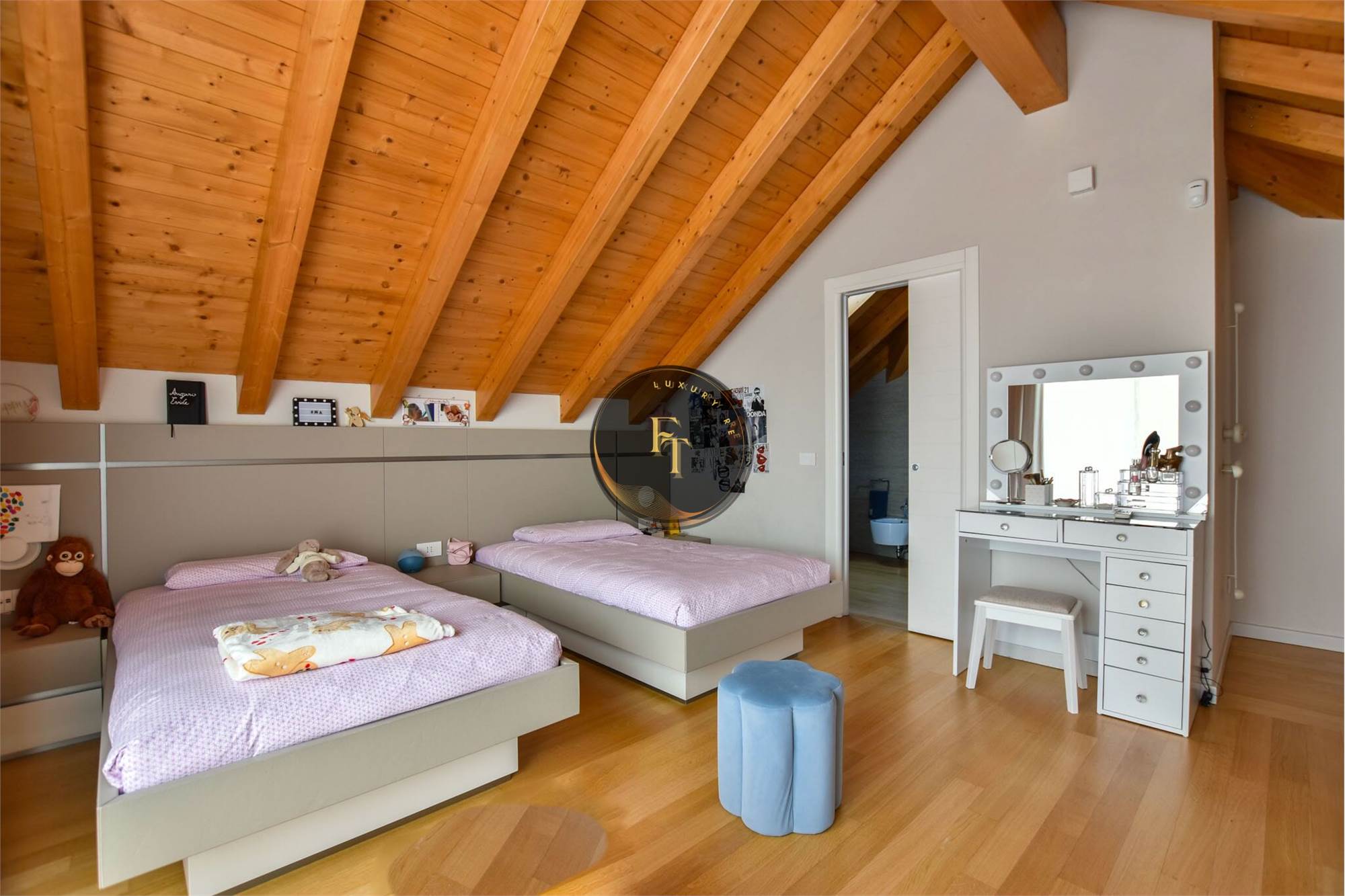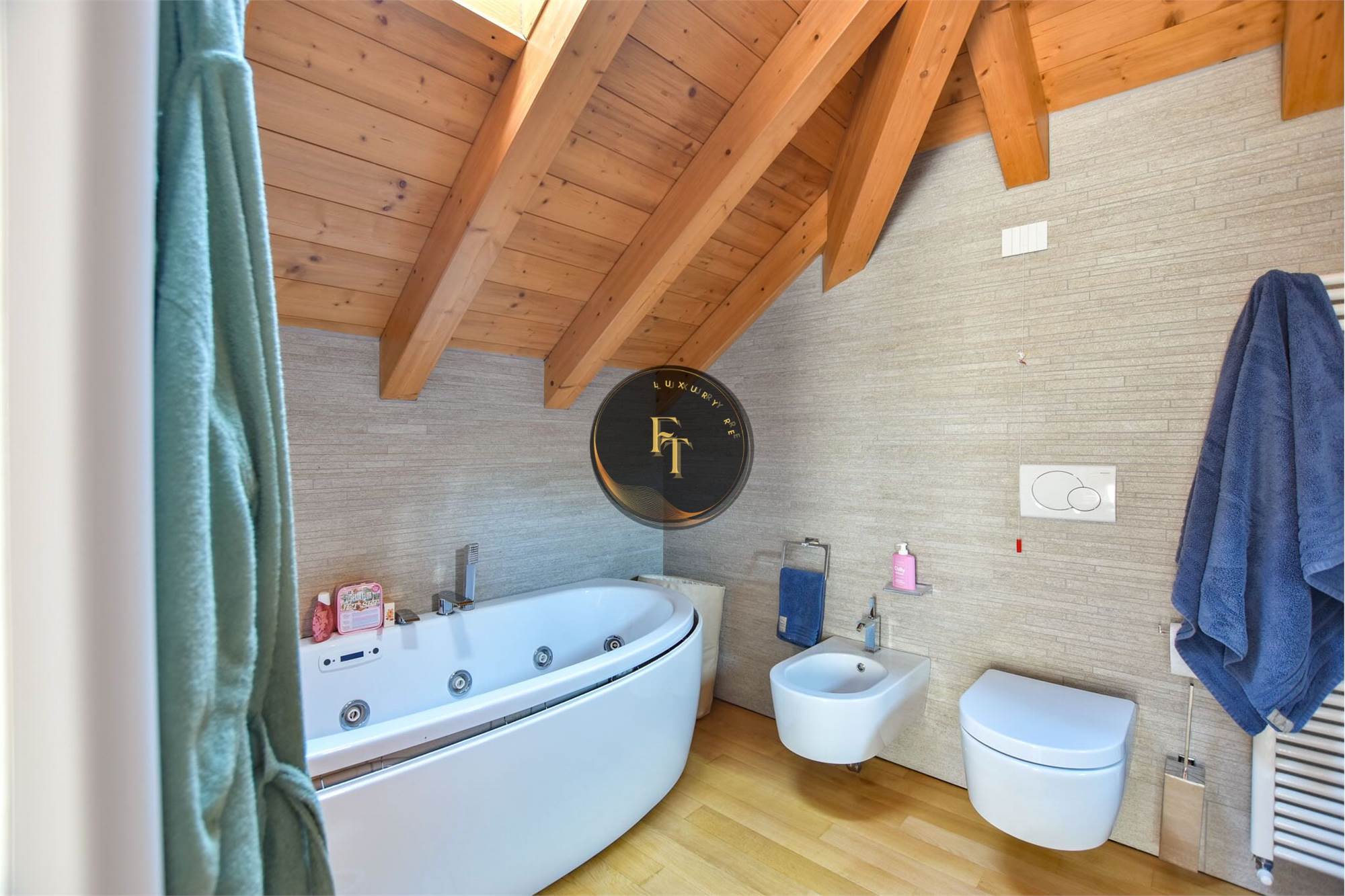 Il primo piano, caratterizzato dal soffitto con travi a vista, ospita uno studio con cabina armadio, una camera matrimoniale con bagno privato con vasca idromassaggio e doccia e balcone, un’ulteriore camera con bagno, anch’esso con doccia e vasca idromassaggio, e la suite padronale: un ampio disimpegno con arredi su misura conduce alla camera principale con doppia cabina armadio Molteni e un bagno interamente in marmo, dotato di vasca idromassaggio centrale, doppia doccia, doppi lavabi e sanitari.