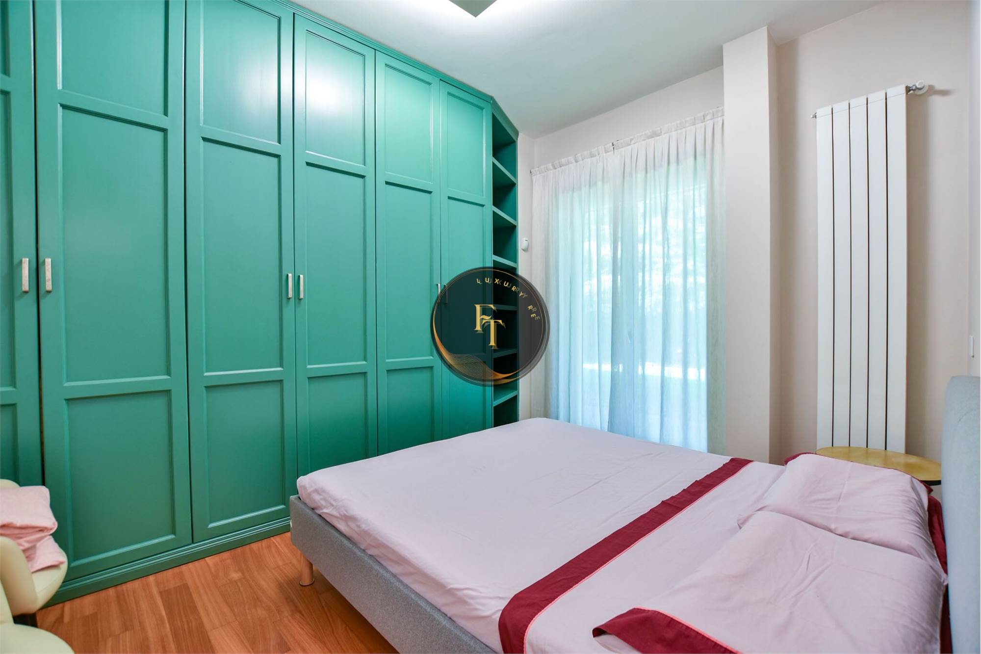 La villa, di circa 1.080 mq complessivi, si sviluppa su più livelli. Al piano terra si apre una spaziosa zona giorno composta da ampio salotto, area pranzo, cucina abitabile e bagno di servizio. Il parquet in rovere chiaro e il marmo, utilizzato per scale e superfici della cucina, creano un filo conduttore elegante e coerente. All’esterno della zona giorno si sviluppa un portico, ideale come zona relax o zona pranzo esterna.